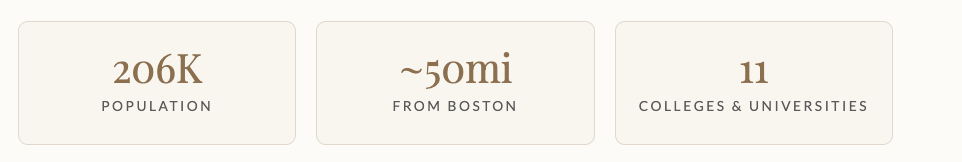 Worcester is a genuine college town. Home to 11 colleges and universities including Holy Cross, WPI, Clark University, Assumption University, and UMass Medical School. This gives the city a youthful, intellectual energy and an unusually rich calendar of lectures, performances, and cultural events for a city of its size.